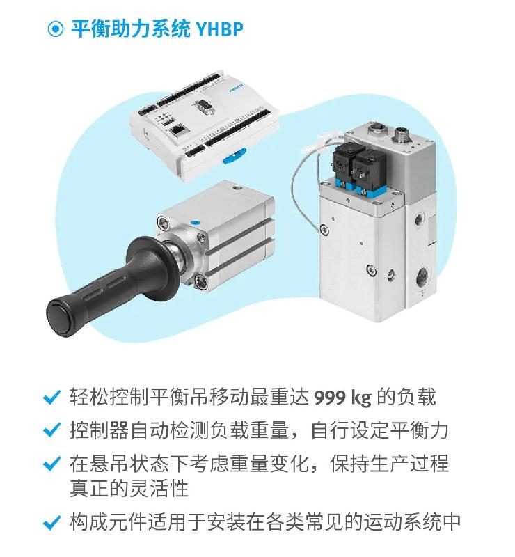 在個(gè)別依靠人工進(jìn)行裝配和搬運(yùn)的環(huán)節(jié),由于負(fù)載未知、負(fù)責(zé)變動(dòng)等情況,給操作人員帶來極大的不便。費(fèi)斯托平衡助力系統(tǒng)YHBP,依托比例控制自動(dòng)適應(yīng)質(zhì)量變化,并適用于不同的結(jié)構(gòu)形式,讓整體操作變得簡(jiǎn)單輕便,提高安全性。同時(shí)簡(jiǎn)潔的氣路便于數(shù)字化的控制,可實(shí)現(xiàn)自動(dòng)的運(yùn)動(dòng)控制,也可實(shí)現(xiàn)故障追溯。