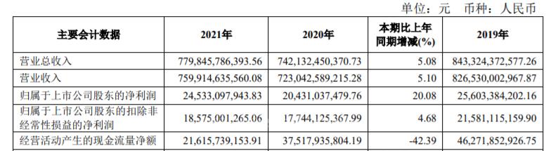 受上海疫情影響,上汽集團(tuán)本應(yīng)在今年3月發(fā)布的2021年年報直到近期才對外公布。2021年年度報告顯示,上汽集團(tuán)2021年營業(yè)總收入達(dá)7798.5億元,同比增長5.1%,歸屬于上市公司股東的凈利潤為245.3億元,同比增長20.1%。