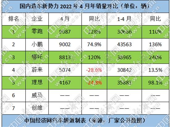 數(shù)據(jù)顯示,4月,零跑、小鵬、哪吒、蔚來和理想的銷量分別為9087輛、9002輛、8813輛、5074輛、4167輛,同比分別增長(zhǎng)228%、74.9%、120%、-28.6%、-24.8%;前4個(gè)月的累計(jì)銷量分別為30666輛、43563輛、38965輛、30842輛、35883輛。