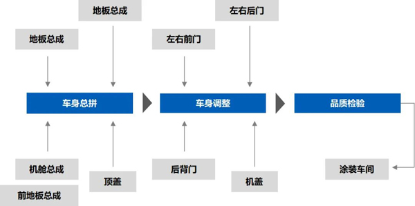 汽車(chē)焊裝為整車(chē)生產(chǎn)四大工藝中的第二道工藝,主要將沖壓成型的車(chē)身組件組裝成一個(gè)完整的車(chē)身。焊裝工藝中,以機(jī)器人的點(diǎn)焊、弧焊為主,中間會(huì)有視覺(jué)檢測(cè)焊接狀態(tài)的工位。