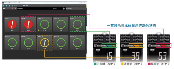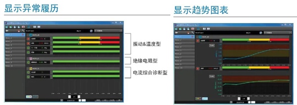 顯示多臺(tái)電機(jī)的報(bào)警狀態(tài),可按時(shí)間順序確認(rèn)電機(jī)狀態(tài)的變化。并通過(guò)圖表掌握測(cè)量值的趨勢(shì)。(測(cè)量和累積的數(shù)據(jù)可以輸出為CSV格式,對(duì)創(chuàng)建報(bào)告和統(tǒng)計(jì)資料非常有用)