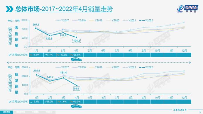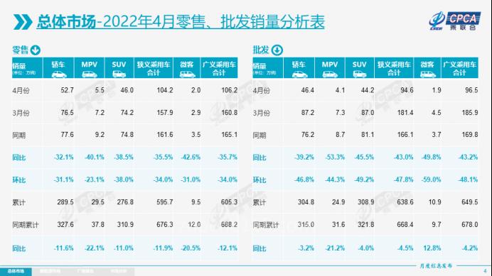 5月10日,乘聯(lián)會發(fā)布最新產(chǎn)銷數(shù)據(jù)顯示,4月乘用車生產(chǎn)96.9萬輛,同比下降41.1%;批發(fā)銷量94.6萬輛,同比下降43.0%;零售銷量104.2萬輛,同比下降35.5%。