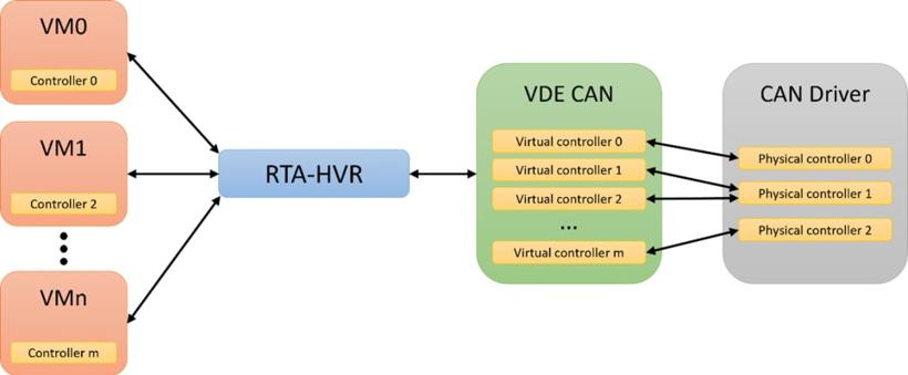 此外,RTA-HVR提供了一種稱為 "虛擬設(shè)備擴(kuò)展"(VDE)的機(jī)制,允許ECU集成商為特定的Zone ECU定制虛擬和物理外設(shè)之間的綁定。VDE提供了一種在虛擬機(jī)之間共享外設(shè)的安全方式(例如,當(dāng)需要一個(gè)外設(shè)的虛擬機(jī)數(shù)量超過(guò)硬件中的物理外設(shè)數(shù)量時(shí))。這里的典型例子是以太網(wǎng)控制器、HW安全模塊和看門狗或增加額外的CAN通道,如下圖所示: