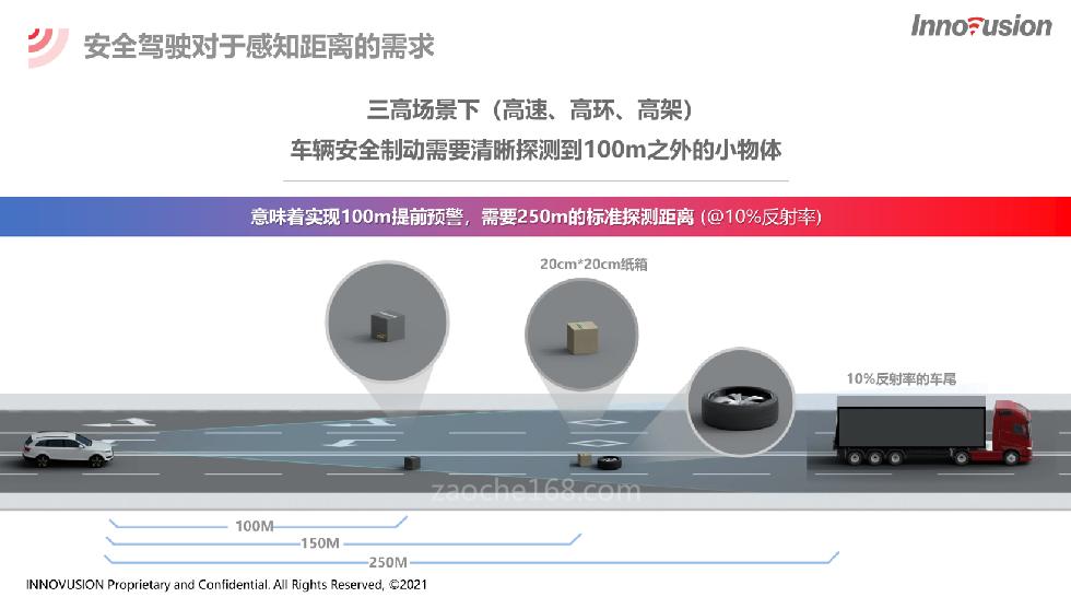 作為駕駛者在開車時(shí)會(huì)碰到各種各樣的障礙物,比如前面的落石,輪胎等,特別是在夜間光線不太好的情況下,靜止障礙物和灑落物這些物體如果不被有效的探測會(huì)造成比較大的安全風(fēng)險(xiǎn)。在高速場景自動(dòng)駕駛的安全制動(dòng)中,100米的距離是激光雷達(dá)感知的及格線。而如果想看到100m以外黑色的小盒子,或者黑色的輪胎,則需要具備250m標(biāo)準(zhǔn)探測距離,才能實(shí)現(xiàn)100m的提前預(yù)警。