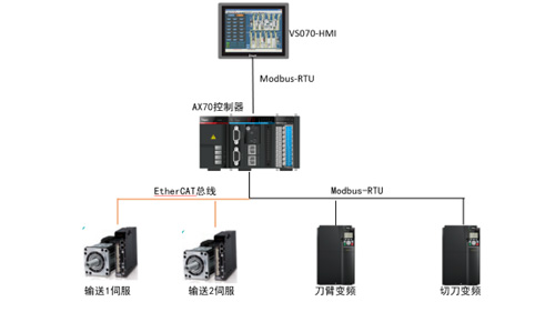 鑒于現(xiàn)實(shí)需求,在廣東某客戶切紙機(jī)上,英威騰推出系統(tǒng)解決方案,包含:AX系列可編程控制器+VS070-HMI+DA200系列高性能伺服(EtherCAT總線型)+GD350系列高性能多功能變頻器。