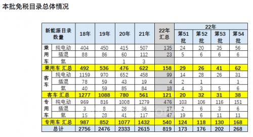 其中的乘用車62款,客車38款,專用車168款的占比較高。2022年的新能源乘用車的目錄總體數(shù)量較少,客車的氫燃料的占比增多。插混推出結(jié)構(gòu)變化,第54批客車插混僅有1款車型。新勢力進(jìn)入免稅目錄車型逐步增多。新勢力造車企業(yè)的車產(chǎn)品逐步進(jìn)入市場化狀態(tài),生存壓力較大,目前客車與專用車基本是傳統(tǒng)企業(yè)為主。