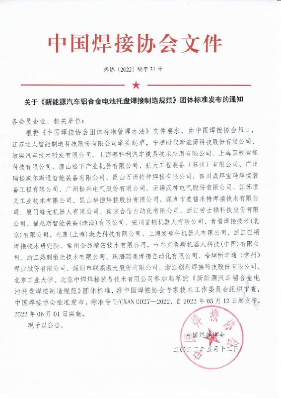 從中國(guó)焊接協(xié)會(huì)獲悉,根據(jù)《中國(guó)焊接協(xié)會(huì)團(tuán)體標(biāo)準(zhǔn)管理辦法》文件要求,由中國(guó)焊接協(xié)會(huì)歸口,江蘇北人智能制造科技股份有限公司牽頭起草,寧德時(shí)代、敏實(shí)集團(tuán)、上海賽科利、凌云股份等30余家企業(yè)共同起草編制的《新能源汽車鋁合金電池托盤焊接制造規(guī)范》團(tuán)體標(biāo)準(zhǔn)已于5月12日發(fā)布,并將于2022年6月1日起實(shí)施。