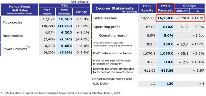 本田汽車在財(cái)報(bào)中表示,預(yù)計(jì)2023財(cái)年凈銷售額為16.25萬(wàn)億日元,同比增長(zhǎng)11.7%,高于市場(chǎng)預(yù)期的16.2萬(wàn)億日元。營(yíng)業(yè)利潤(rùn)將為8100億日元(約合63億美元),同比下降7%,不及市場(chǎng)預(yù)期的9430億日元。