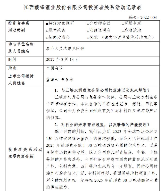5月16日晚,贛鋒鋰業(yè)披露近期投資者關(guān)系活動(dòng)記錄表,其中提及該公司碳酸鋰產(chǎn)能規(guī)劃、電池產(chǎn)能規(guī)?,F(xiàn)狀及未來(lái)規(guī)劃等方面內(nèi)容。