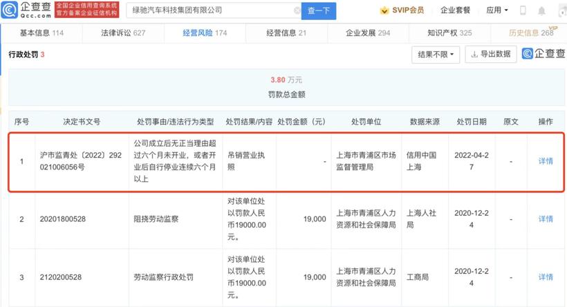 從企查查APP獲悉,5月17日,綠馳汽車(chē)科技集團(tuán)有限公司被上海市青浦區(qū)市場(chǎng)監(jiān)督管理局吊銷營(yíng)業(yè)執(zhí)照,原因是公司成立后無(wú)正當(dāng)理由超過(guò)六個(gè)月未開(kāi)業(yè)或者開(kāi)業(yè)后自行停業(yè)連續(xù)六個(gè)月以上。