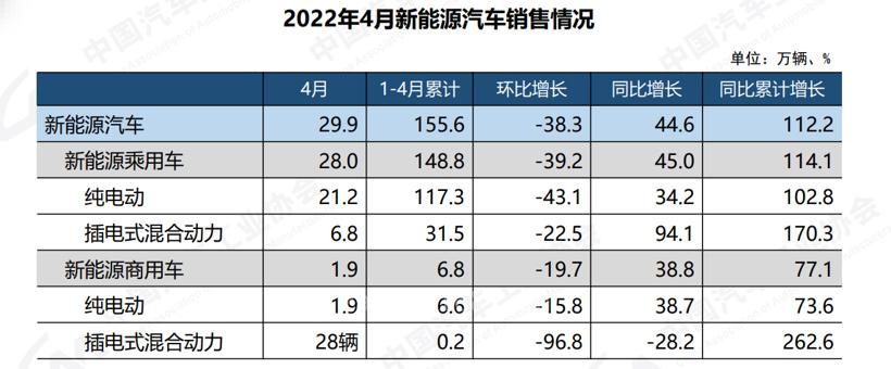 中國汽車工業(yè)協(xié)會的最新數(shù)據(jù)顯示,今年4月,中國新能源汽車產(chǎn)銷分別達到31.2萬輛和29.9萬輛,同比分別大增43.9%和44.6%,市場占有率達到25.3%。今年前4個月,中國新能源汽車產(chǎn)銷分別為160.5萬輛和155.6萬輛,同比增長均為1.1倍,市場占有率達到20.2%。與上年同期相比,純電動汽車、插電式混合動力汽車和燃料電池汽車產(chǎn)銷繼續(xù)保持了高速增長勢頭。