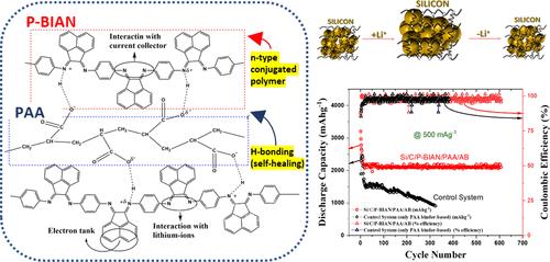 該復合聚合物結構像網一樣將硅顆粒固定在一起,以防止破裂。兩種聚合物之間的氫鍵允許結構自我修復,無論聚合物在何時斷裂,它們都可以重新連接。此外,P-BIAN的n型摻雜能力提高了陽極的導電性,并通過限制陽極上電解質的電解分解來保持較薄的SEI。
