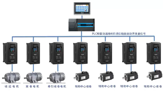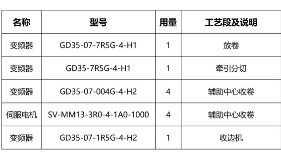 牽引分切機(jī)構(gòu)采用Goodrive35-H1變頻器驅(qū)動(dòng)異步電機(jī)做閉環(huán)速度控制,其作為龍門分切機(jī)的主機(jī),編碼器分頻輸出給收卷、放卷、收邊變頻器作為線速度信號,不依賴通信就可以運(yùn)行,系統(tǒng)穩(wěn)定可靠;