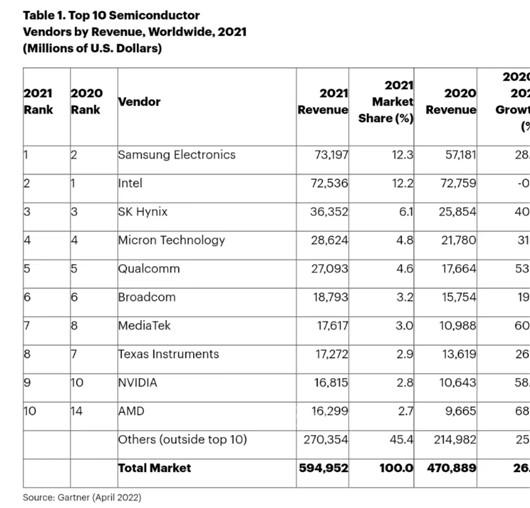 在業(yè)界較為關注的Top 10半導體供應商排行榜里,三星電子、英特爾、SK海力士、美光科技、高通、博通、聯(lián)發(fā)科、德州儀器、英偉達和AMD成為2021年營收最強的行業(yè)巨頭。三星的芯片業(yè)務最為生猛,去年銷售額排名全球第一,這也是該公司自2018年以來首次超越英特爾,重回冠軍的寶座。