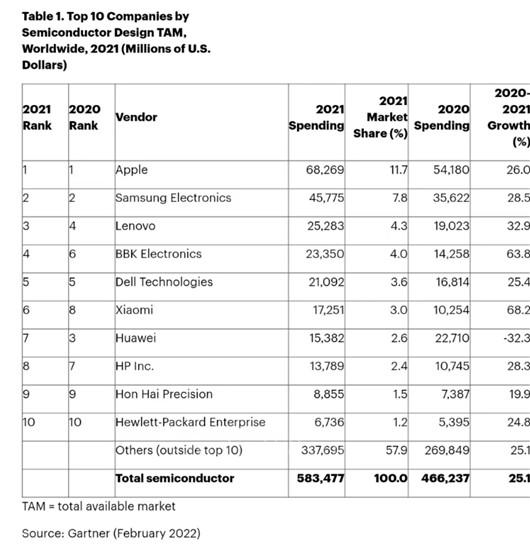 另一邊,作為主要購買方的原始設備制造商(OEM)也為了囤貨擴增支出,雖然芯片短缺和新冠肺炎肆虐限制了生產(chǎn),但排名Top 10的OEM們依舊在2021年為芯片增加了高達25.2%的支出。榜單里的十巨頭擁有超強的“剁手”能力,過去一年為芯片花掉的真金白銀占全球OEM總支出的42%,可謂扛下芯片購買力的半壁江山。