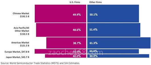 總部位于美國的半導體公司,在過去的2021年搶占了全球半導體市場約46.3%的份額,并在中國市場拿下高達49.9%的芯片訂單。這也意味著,中國半導體市場的蛋糕,有將近一半被美國公司吃掉了。