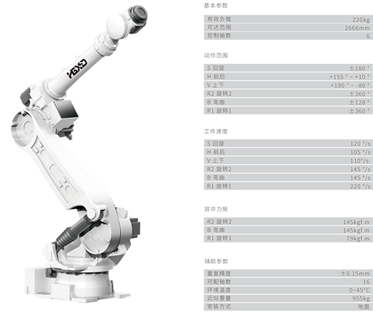該工作站所使用的哈工現(xiàn)代HS220機(jī)型負(fù)載能力220kg、可達(dá)范圍2666mm、重復(fù)精度±0.15mm,機(jī)型參數(shù)如下: