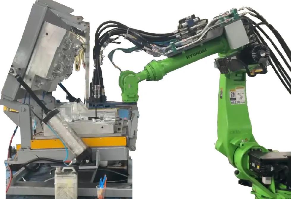 2. 哈工現(xiàn)代機(jī)器人接收信號(hào)后,跟隨轉(zhuǎn)盤轉(zhuǎn)動(dòng)的速度,隨著轉(zhuǎn)盤一起轉(zhuǎn)動(dòng),并在此過程中,對(duì)模具內(nèi)部進(jìn)行噴射發(fā)泡膠料;