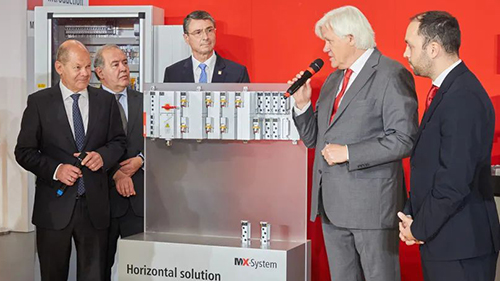 倍福全球總裁 Hans Beckhoff 向德國總理奧拉夫·舒爾茨和葡萄牙總理安東尼奧·科斯塔展示用于實現(xiàn)無控制柜自動化的 MX 系統(tǒng)。