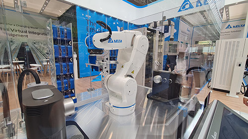 臺(tái)達(dá)全新的 MPD 系列變頻器適用于水泵和風(fēng)機(jī)應(yīng)用,其電機(jī)高效、節(jié)能且集成有無風(fēng)扇變頻器,是智能供水過程的理想助手。另一款臺(tái)達(dá)的亮點(diǎn)產(chǎn)品是全新 ASDA – B3 系列,這是一套體積小巧的高效伺服系統(tǒng),可提供簡(jiǎn)單易用的操作環(huán)境和精確的運(yùn)動(dòng)控制功能。為展示這些工業(yè)自動(dòng)化解決方案之間能夠輕松兼容,我們制作了一臺(tái)融合了臺(tái)達(dá)三個(gè)解決方案(機(jī)器人運(yùn)動(dòng)程序、HMI 后端程序和 AX-8 控制器程序)的咖啡制作機(jī)器人工作站。該工作站將于展覽期間展示絕技。