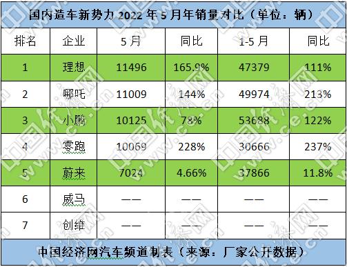 具體來看,5月,理想、哪吒、小鵬、零跑和蔚來的銷量分別為11496輛、11009輛、10125輛、10069輛、7024輛,同比分別增長165.9%、144%、78%、228%、4.66%;前5個(gè)月的累計(jì)銷量分別為47379輛、49974輛、53688輛、30666輛、37866輛,同比分別增長111%、213%、122%、237%、11.8%。