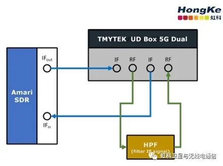 對于圖中所示的測試設(shè)置,基于Amarisoft SDR的UE模擬器與虹科雙通道上/下變頻器一起使用,UD Box 5G將高頻毫米波信號轉(zhuǎn)換為RF,該射頻反饋至HPF。該測試展示了將現(xiàn)有的sub-6GHz的模擬器用于5G毫米波的能力。