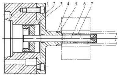 1—螺釘 2—接套 3—法蘭盤 4—定位塊 5—夾具體 6—拉心 7—脹瓦