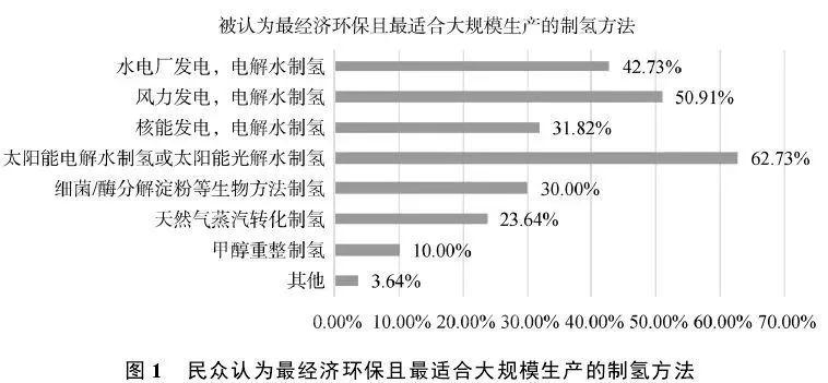 作者進(jìn)行了《關(guān)于氫能源汽車的技術(shù)認(rèn)知及發(fā)展前景調(diào)查》(以下全部簡稱為《調(diào)查》)的調(diào)查報(bào)告,報(bào)告中對(duì)于"你認(rèn)為最經(jīng)濟(jì)環(huán)保且最適合大規(guī)模生產(chǎn)的制氫方法是什么?”(如圖1),有62.73%的人認(rèn)為是"太陽能電解水制氫或太陽能光解水制氫”,占比最高;其次是"風(fēng)力發(fā)電,電解水制氫”,占比50.91%,該兩項(xiàng)數(shù)據(jù)也可以充分說明人們對(duì)風(fēng)電制氫和太陽能發(fā)電制氫的期望和科學(xué)的制氫方式是相吻合的。
