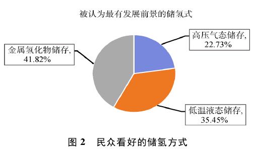固態(tài)吸氫材料儲(chǔ)氫是利用某些金屬絡(luò)合物來吸附氫氣的。研究發(fā)現(xiàn),把鎂、鈦、鋯、鈮、鑭等金屬及它們的合金制成絡(luò)合物,再將它們置于高壓(<5MPa)的氫氣環(huán)境中,這些金屬就會(huì)像海綿吸水一樣把氫氣儲(chǔ)存起來,只需通過加熱或減壓的方式就能讓它們把氫氣釋放出來。金屬氫化物單位體積的儲(chǔ)氫密度是相同溫度、壓力條件下氣態(tài)氫的1000倍,儲(chǔ)氫能力優(yōu)于氣態(tài)儲(chǔ)氫和液態(tài)儲(chǔ)氫。在《調(diào)查》中(見圖2),約有42%的人認(rèn)為"金屬氫化物儲(chǔ)存"是最有發(fā)展前景的車載儲(chǔ)氫方式(占比最大),可見該儲(chǔ)氫方式的確是最符合汽車的使用要求的。