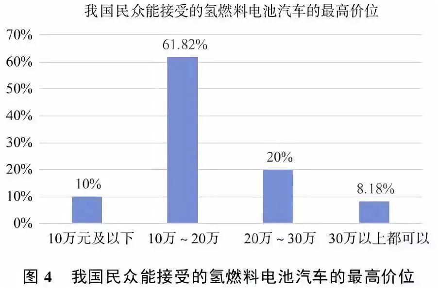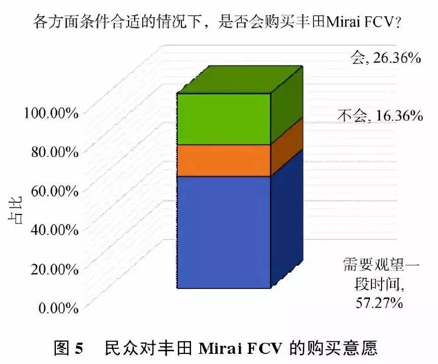 產(chǎn)業(yè)模式上,應(yīng)該做好中長期的產(chǎn)業(yè)布局,目前可以讓燃料電池商用車做好示范運(yùn)行,再逐漸把燃料電池技術(shù)推廣和應(yīng)用至乘用車上。成本的降低不僅依靠技術(shù)的進(jìn)步,還有賴于規(guī)模化生產(chǎn)。目前,中國生產(chǎn)的燃料電池組成本需10000美元/kW,日本生產(chǎn)的燃料電池組成本也需2000美元/kW,美國能源局經(jīng)過測算認(rèn)為只有當(dāng)燃料電池的成本降至50美元/kW時(shí),才能與內(nèi)燃機(jī)汽車形成競爭。通過《調(diào)查》還發(fā)現(xiàn),以中國目前的消費(fèi)水平,有61.82%的人能接受的氫燃料電池汽車的價(jià)格都在10?20萬這個(gè)區(qū)間(如圖4),參照豐田Mirai現(xiàn)在30萬元左右的售價(jià),顯然FCV的價(jià)格還不能引起人們的購買欲望(從圖5有57.27%的人持觀望態(tài)度也可以看出),反映出來的問題便是氫燃料電池的成本還有極大的下降空間。