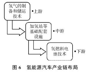 發(fā)展和推廣氫能源汽車是個(gè)復(fù)雜而系統(tǒng)的工程,單一發(fā)展某一項(xiàng)技術(shù)不可能實(shí)現(xiàn)成功,需要統(tǒng)籌兼顧整條產(chǎn)業(yè)鏈。布局好整條產(chǎn)業(yè)鏈的上中下游(如圖6),調(diào)動(dòng)國內(nèi)大型能源企業(yè)和裝備制造企業(yè)參與,共建基礎(chǔ)設(shè)施,多管齊下,才能為加速氫能源汽車產(chǎn)業(yè)的發(fā)展提供保障。