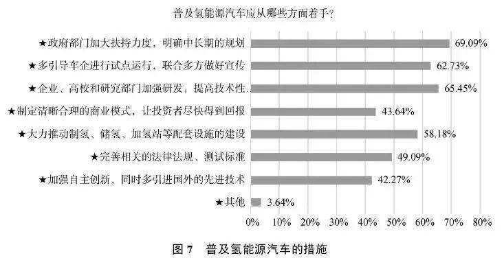 汽車產(chǎn)業(yè)牽涉到科技、文化、經(jīng)濟(jì)等多個(gè)社會(huì)領(lǐng)域,代表著國家的發(fā)展意志,因此政府的政策支持與引導(dǎo)就顯得尤為重要?!墩{(diào)查》中顯示,對(duì)于普及氫能源汽車應(yīng)從哪些方面著手?(如圖7)超過半數(shù)的民眾都支持以下幾個(gè)方面:①政府部門加大扶持力度,明確中長期的規(guī)劃;@企業(yè)、高校和研究部門加強(qiáng)研發(fā),提高技術(shù)性能,同時(shí)降低生產(chǎn)成本;③多引導(dǎo)車企進(jìn)行試點(diǎn)運(yùn)行,聯(lián)合多方做好宣傳;④大力推動(dòng)制氫、儲(chǔ)氫、加氫站等配套設(shè)施的建設(shè)。由此可見,普及氫能源汽車,人們認(rèn)為對(duì)政策、科技和基礎(chǔ)設(shè)施的投入最為重要。