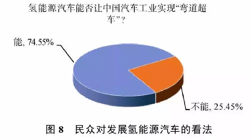 我國有世界上最龐大的汽車消費(fèi)市場、對(duì)能源結(jié)構(gòu)的轉(zhuǎn)型需求迫切、對(duì)氫燃料電池汽車的扶持政策十分優(yōu)越,且產(chǎn)業(yè)鏈也在加緊布局,這些條件都為氫能源汽車在中國的發(fā)展提供了最佳契機(jī)。在《調(diào)查》中發(fā)現(xiàn),有74.55%的人認(rèn)為通過發(fā)展氫能源汽車能讓中國的汽車企業(yè)實(shí)現(xiàn)"彎道超車”(如圖8),也就是將近有3/4的人對(duì)氫能源汽車的發(fā)展持樂觀態(tài)度。希望中國能盡快實(shí)現(xiàn)氫能汽車的產(chǎn)業(yè)化,相信中國也一定能通過自己的努力從汽車大國轉(zhuǎn)變成汽車強(qiáng)國。