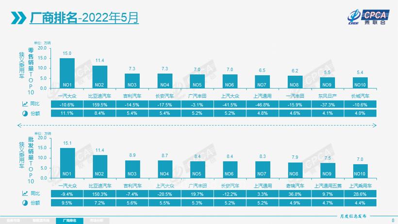 進(jìn)入5月,國(guó)內(nèi)新冠疫情有所緩解,不少地區(qū)管控解除,汽車消費(fèi)需求得到一定程度釋放。從5月零售量數(shù)據(jù)看,盡管同比呈現(xiàn)16.9%的降幅,但相較4月35%的同比降幅改善了17個(gè)百分點(diǎn)。不過,跟往年同期數(shù)據(jù)相比,依然處于低位。