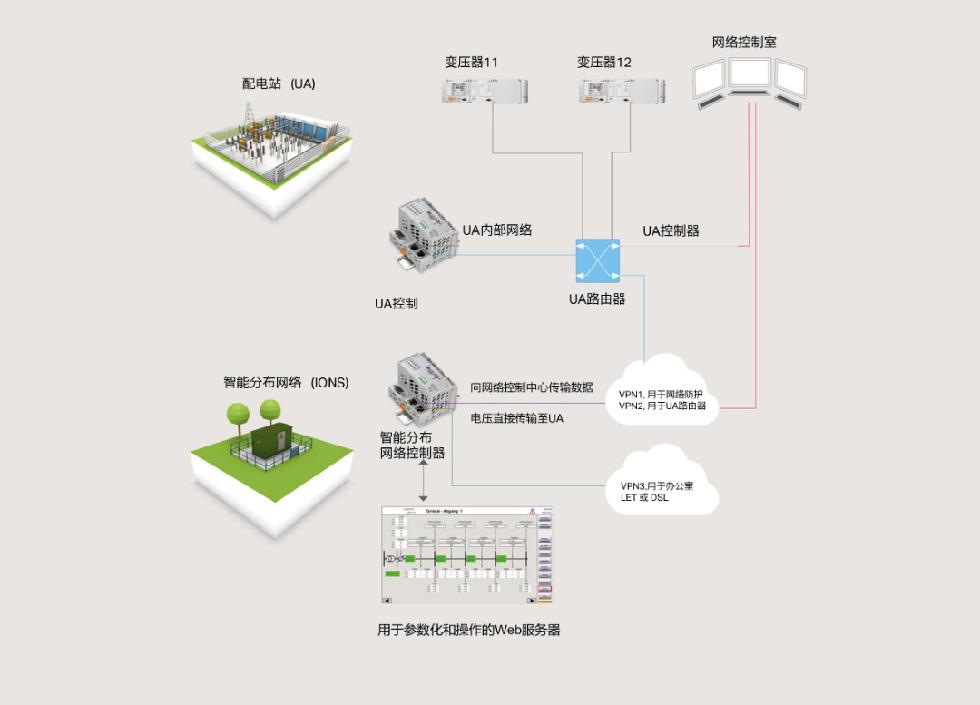 萬(wàn)可是這種創(chuàng)新網(wǎng)絡(luò)優(yōu)化的推動(dòng)力。采用萬(wàn)可控制和測(cè)量技術(shù)的變電站是大范圍控制的一個(gè)重要組成部分。在此方案中,萬(wàn)可PFC200控制器作為中央數(shù)據(jù)節(jié)點(diǎn)在站點(diǎn)中發(fā)揮作用。