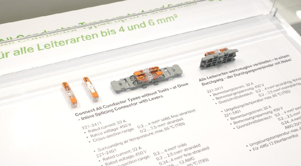 除了大功率PCB,在本次展會(huì)上產(chǎn)品管理開關(guān)柜組件負(fù)責(zé)人Michael D?rbaum 博士還為我們介紹了萬(wàn)可帶有操作手柄的連接器家族。對(duì)于工廠布線或客戶現(xiàn)場(chǎng)布線,該類型連接器無需接線工具即可完成接線工作,更加快速、安全。對(duì)于能源設(shè)備中需要不同類型的導(dǎo)線連接,萬(wàn)可豐富的連接器產(chǎn)品可以滿足其應(yīng)用要求。