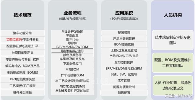 構(gòu)建全新的滿足定制化需求的車型配置選裝管理模式;基于中央制造BOM集中管控,實(shí)現(xiàn)面向多基地生產(chǎn)的制造管理模式;打通上下游(工程、制造、售后)協(xié)調(diào)一致的的變更實(shí)施管控機(jī)制;基于售后工程介入工程方案評(píng)估的同步工程設(shè)計(jì)模式。