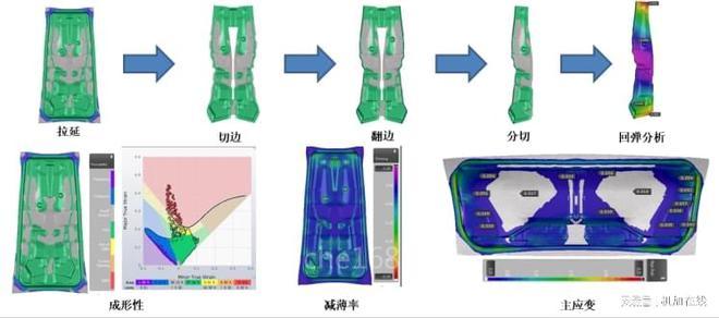 采用Autoform 軟件,實(shí)現(xiàn)零件成型全工序分析,識(shí)別零件剛度、滑移線、沖擊線、回彈等問(wèn)題,并針對(duì)性的提出解決方案,確保零件質(zhì)量滿足要求,減少后期模具調(diào)試周期。