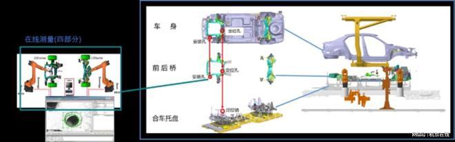 廣州工廠首先以底盤全自動(dòng)合裝為項(xiàng)目試點(diǎn),開發(fā)了一套數(shù)據(jù)互聯(lián)互通應(yīng)用方案。車身車間布置在線藍(lán)光檢測(cè)設(shè)備,測(cè)量每臺(tái)車的尺寸數(shù)據(jù);總裝在前后橋區(qū)域布置在線測(cè)量工作站,測(cè)量每臺(tái)前后橋總成的安裝孔位尺寸;托盤緩存區(qū)布置藍(lán)光檢測(cè)設(shè)備,測(cè)量托盤定位銷尺寸數(shù)據(jù);測(cè)量數(shù)據(jù)經(jīng)過(guò)編碼標(biāo)識(shí)后,通過(guò)MES系統(tǒng)上傳至智能匹配系統(tǒng)中,與質(zhì)量數(shù)據(jù)管理系統(tǒng)上傳來(lái)的來(lái)料數(shù)據(jù)一起,通過(guò)匹配算法,虛擬計(jì)算自動(dòng)合裝尺寸匹配狀態(tài),將結(jié)果輸出至工位上,提前應(yīng)對(duì)解決。