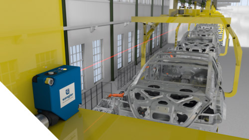 在汽車行業(yè)中使用激光測(cè)距傳感器測(cè)量與前部支架的距離,從而控制兩者不發(fā)生碰撞。歸功于傳感器能在10米大范圍以較大角度識(shí)別不同表面,可確保生產(chǎn)中不發(fā)生碰撞。