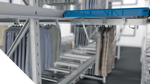時(shí)裝行業(yè)全自動(dòng)懸掛式穿梭裝置,豐富多彩的服裝套有透明的保護(hù)膜。wintec技術(shù)傳感器能夠可靠地識(shí)別這些透明的反射性保護(hù)膜,包括深色衣物,提供詳細(xì)的件數(shù)和貨架占用數(shù)據(jù)。
