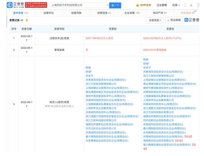 近日,企查查顯示,上海同馭汽車科技有限公司發(fā)生工商變更,新增小米集團關(guān)聯(lián)公司海南極目創(chuàng)業(yè)投資有限公司為股東,同時公司注冊資本由3007.78萬元增至3226.53萬元。