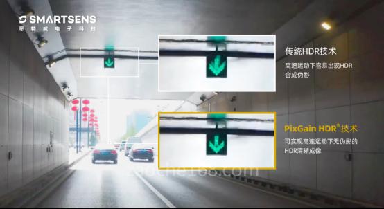 針對(duì)高速運(yùn)動(dòng)的行車應(yīng)用場景,傳統(tǒng)HDR技術(shù)在影像合成中容易出現(xiàn)偽影現(xiàn)象。SC220AT采用了思特威創(chuàng)新的PixGain HDR?技術(shù),通過在同一幀曝光下的High Gain(高轉(zhuǎn)換增益)及Low Gain(低轉(zhuǎn)換增益)雙影像結(jié)合,可在運(yùn)動(dòng)拍攝過程中實(shí)現(xiàn)無運(yùn)動(dòng)偽影的高品質(zhì)HDR成像。