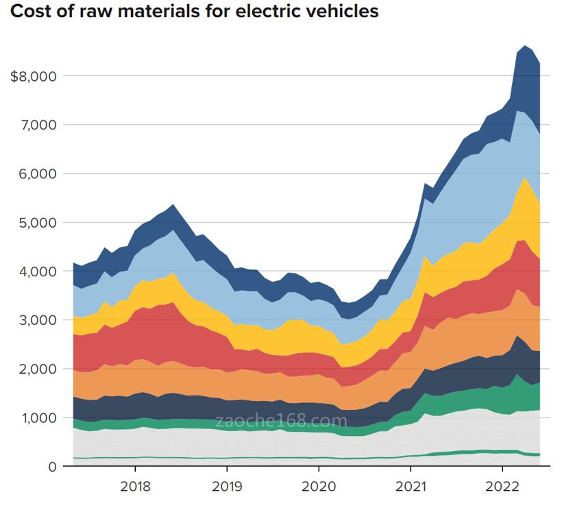 截至今年5月,每輛電動(dòng)汽車的平均原材料成本總計(jì)8,255美元,較2020年3月的3,381美元上漲了144%,其中鈷、鎳和鋰等材料成本最高,而這些材料都是生產(chǎn)電動(dòng)汽車的電池所必需的。根據(jù)AlixPartners的數(shù)據(jù),電動(dòng)汽車特有的成本在過去兩年從大約2,000美元上升到了4,500美元。