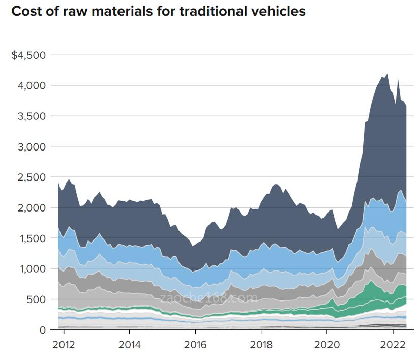 不過,成本上漲的不僅僅是電動(dòng)汽車,在新冠期間,傳統(tǒng)內(nèi)燃機(jī)汽車的原材料成本也增加了一倍多,達(dá)到每輛3,662美元,比2020年3月每輛1,779美元的平均水平增長了106%。鋼鐵和鋁的價(jià)格上漲是這一增長的主要原因。