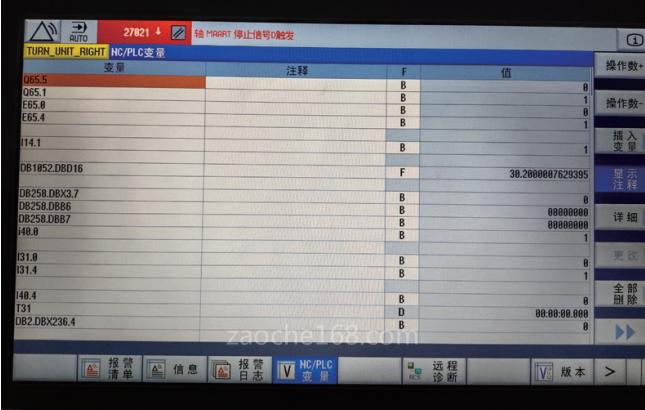 結(jié)合以上可能的原因,查閱機床電氣說明書,找到液力耦合器接近開關(guān)的信號輸入點:E65.4為液力耦合器退回的信號輸入,E65.0為液力耦合器結(jié)合的信號輸入。進入機床PLC監(jiān)控界面(見圖2),輸入E65.0、E65.4兩個信號點,然后再結(jié)合和松開液力耦合器,觀察接近開關(guān)的狀態(tài):發(fā)現(xiàn)在結(jié)合液力耦合器時,接近開關(guān)信號輸入正常,而松開液力耦合器退回時,接近開關(guān)沒有信號輸入。首先拆開銑削頭側(cè)邊蓋板,檢測液力耦合器松開接近開關(guān)的線路,無接觸不良和斷路現(xiàn)象。然后對比液力耦合器結(jié)合接近開關(guān)的阻值,判斷松開接近開關(guān)是否損壞,經(jīng)判斷阻值正常無損壞。最后,故障原因鎖定在液力耦合器液壓缸沒有回退到位[2]。