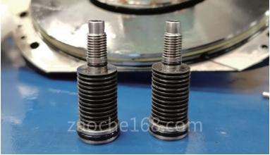 液力耦合器液壓缸回退是靠2組(每組22片)碟形彈片(見圖3)實現(xiàn)的,造成回退不到位的主要原因可能是:碟形彈片損壞,液壓缸活塞卡滯,或液壓缸回油不暢。需對液力耦合器的液壓缸進行拆檢,注意拆卸液壓缸后端端蓋時一定要做好刻度記號,防止后續(xù)裝配位置錯誤而導(dǎo)致液力耦合器不能正常耦合。拆開液壓缸后檢查發(fā)現(xiàn),液力耦合器液壓缸無卡滯損傷現(xiàn)象,但2組碟形彈片中有幾個碟片損壞。更換損壞的碟形彈片后,試機查看液力耦合器是否能正常結(jié)合和松開,手動操作液力耦合器執(zhí)行動作時,因機械結(jié)構(gòu)的特殊性,銑削主軸需要定位在0°,如不能正常執(zhí)行耦合與脫開動作,則需對主軸的角度或者是液壓缸端蓋位置進行微調(diào)。調(diào)整時先將液力耦合器耦合上,斷使能,然后調(diào)整端蓋角度,使主軸的角度顯示在0?位置就可以了。液力耦合器手動耦合和松開動作正常且無任何滯后現(xiàn)象說明耦合位置非常理想。若耦合過程中銑削主軸有負載變化或耦合動作緩慢,則說明耦合角度需要進一步調(diào)整,直到耦合、松開完全順暢后方可正常執(zhí)行自動換刀程序,做進一步測試[3]。