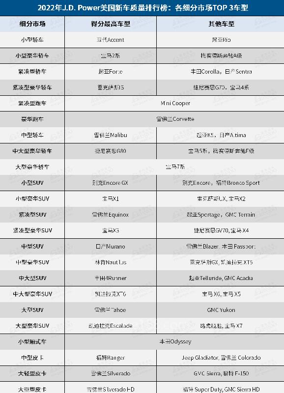 由此看出,通用汽車是今年榜單中的最大贏家,旗下四個(gè)品牌(別克、雪佛蘭、凱迪拉克、GMC)的新車質(zhì)量普遍提高,因此通用在汽車制造商中排名最高。別克從2021年的第12名躍升為今年排名最高的品牌。雪佛蘭Corvette是美國(guó)新車質(zhì)量最高的車型,每100輛車有101個(gè)質(zhì)量問題。此外,通用汽車的車型獲得的獎(jiǎng)項(xiàng)最多,其次是寶馬。在高端品牌中,捷尼賽思在美國(guó)的新車質(zhì)量最好,排名第4。