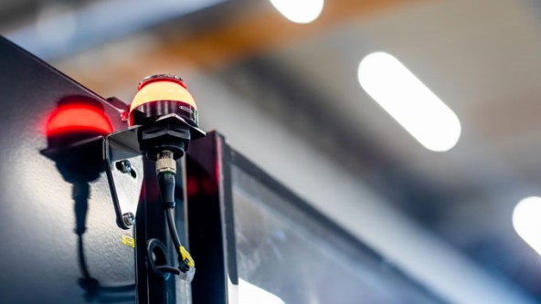 測試區(qū)域配備了圖爾克的K50信號燈,它們在PLC的控制下更改顏色。因此,與傳統(tǒng)的固定顏色信號燈不同,每個(gè)門口一個(gè)指示燈就已足夠。編程時(shí),無需僅限于選擇單個(gè)顏色。LED可單獨(dú)控制。控制裝置配備了具有聲音功能的信號燈,因此系統(tǒng)也可發(fā)出聲音警告信號。