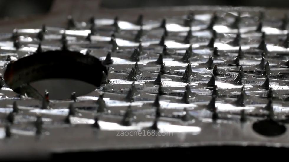 經(jīng)過處理的鋼材送入機器壓平,沖壓機施加近千噸的壓力以沖壓出單個剎車片支撐板,這些背板經(jīng)質(zhì)量檢測合格后被標(biāo)上序列號。接下來送入NRS機器,也就是把支撐板的表面做成凹凸不平的樣子。這種NRS倒刺技術(shù),多應(yīng)用于高端車與賽車等,其特點就是不需要刷膠。